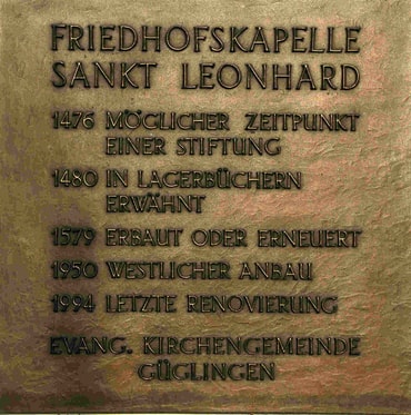 Der Altertumsforscher und Güglinger Pfarrer Karl Klunzinger erwähnt in seinen Aufzeichnungen einen steinernen Bogen mit dem württembergischen Wappen und der Inschrift Lorenz German Stadtschreiber. Dieser war von 1575 bis 1613 Güglinger Stadtschreiber. Dieser steinerne Bogen könnte sich auf eine Friedhofserweiterung oder Neugestaltung beziehen. Vielleicht im Zuge der durch die erwähnte Bauinschrift nahegelegten Baumaßnahmen an der Leonhardskapelle im Jahre 1579.